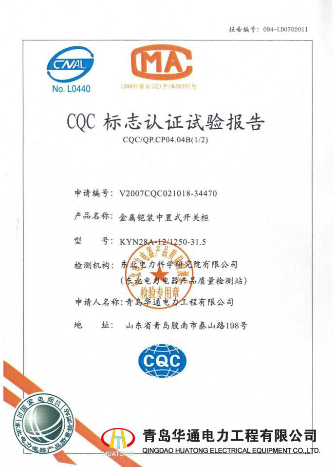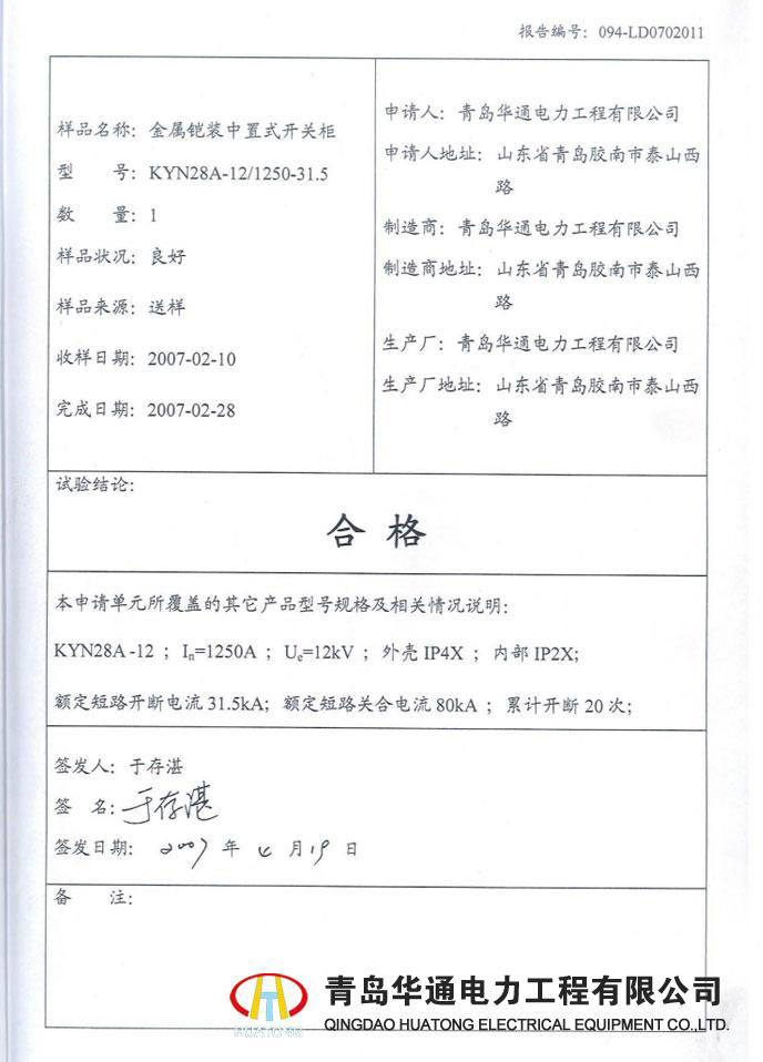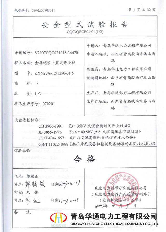 KYN61-40.5高壓開(kāi)關(guān)柜型式試驗(yàn)報(bào)告